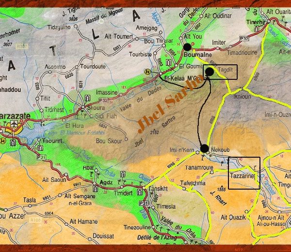 Parmi les lauriers roses, les palmiers, les vasques d’eau et les plateaux de roches tabulaires, descente de la vallée de Tiglagla jusqu’au village d’Agorzée ; traversée des magnifiques gorges d’Ouringui (2210 m)… vue fantastique sur toute la chaîne du Saghro ! Découverte de quelques villages typiques et arrivée au bivouac de Berkou. Une étape qui permet d’admirer toute la beauté des lieux entre gorges, palmiers et roches aux formes insolites, de rencontrer tout au long de la journée les nomades Aït Atta et de goûter à leur délicieux « ourfen » (pain cuit sur la pierre et dans la terre avec oignons et épices).